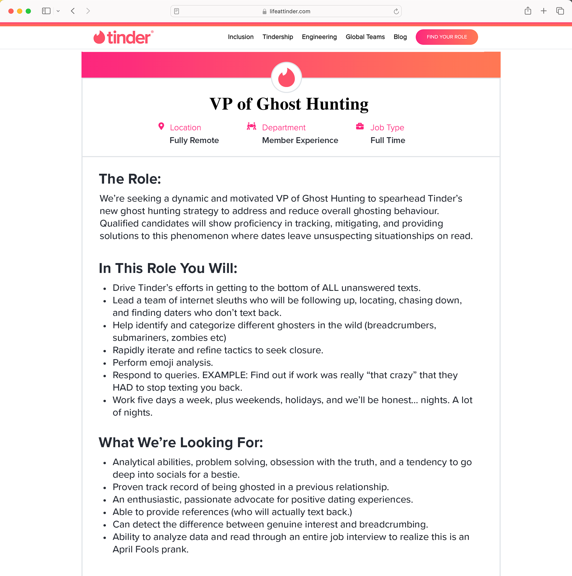 Fire up those LinkedIn profiles. For April Fools Day 2024 Tinder began (and ended) the search for their first VP of Ghost Hunting: a romantic super slueth to track down ghosting daters.